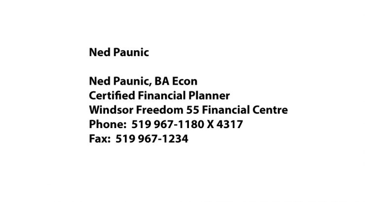 Ned Paunic Ned Paunic, BA Econ Certified Financial Planner Windsor Freedom 55 Financial Centre Phone: 519 967-1180 X 4317 Fax: 519 967-1234